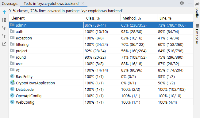 현재 크립토하우스 백엔드의 테스트 라인 커버리지는 약 73%에요.