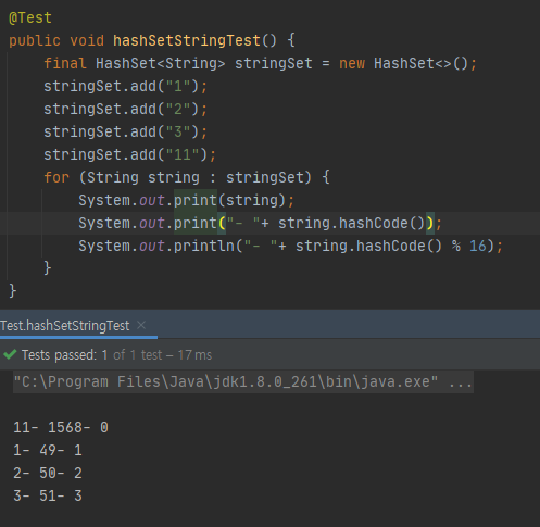 "11"의 해시 코드는 1568인데, 이를 버킷수 16으로 나누면 0이라서 배열에 가장 앞에 저장했던 거군요!