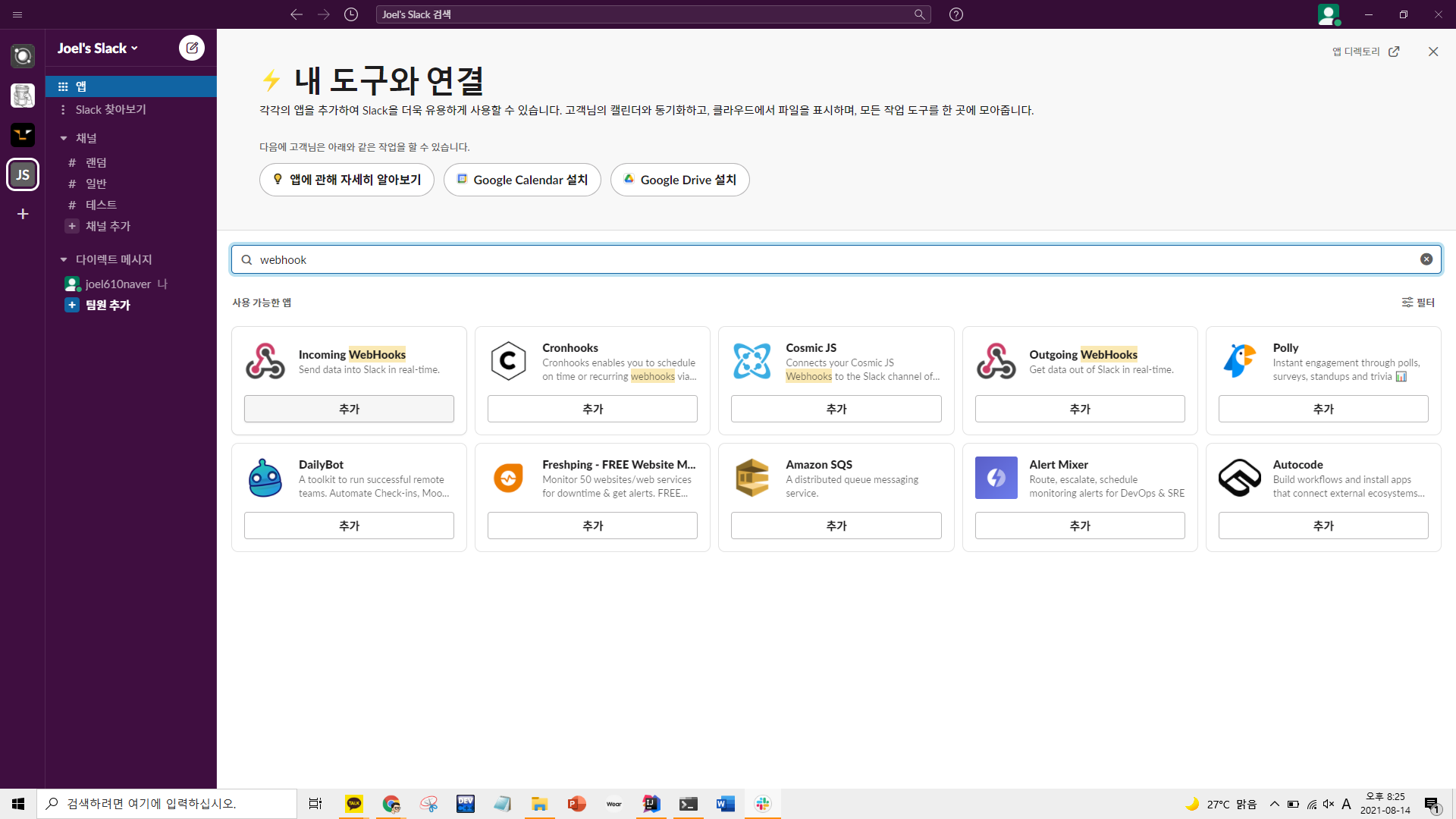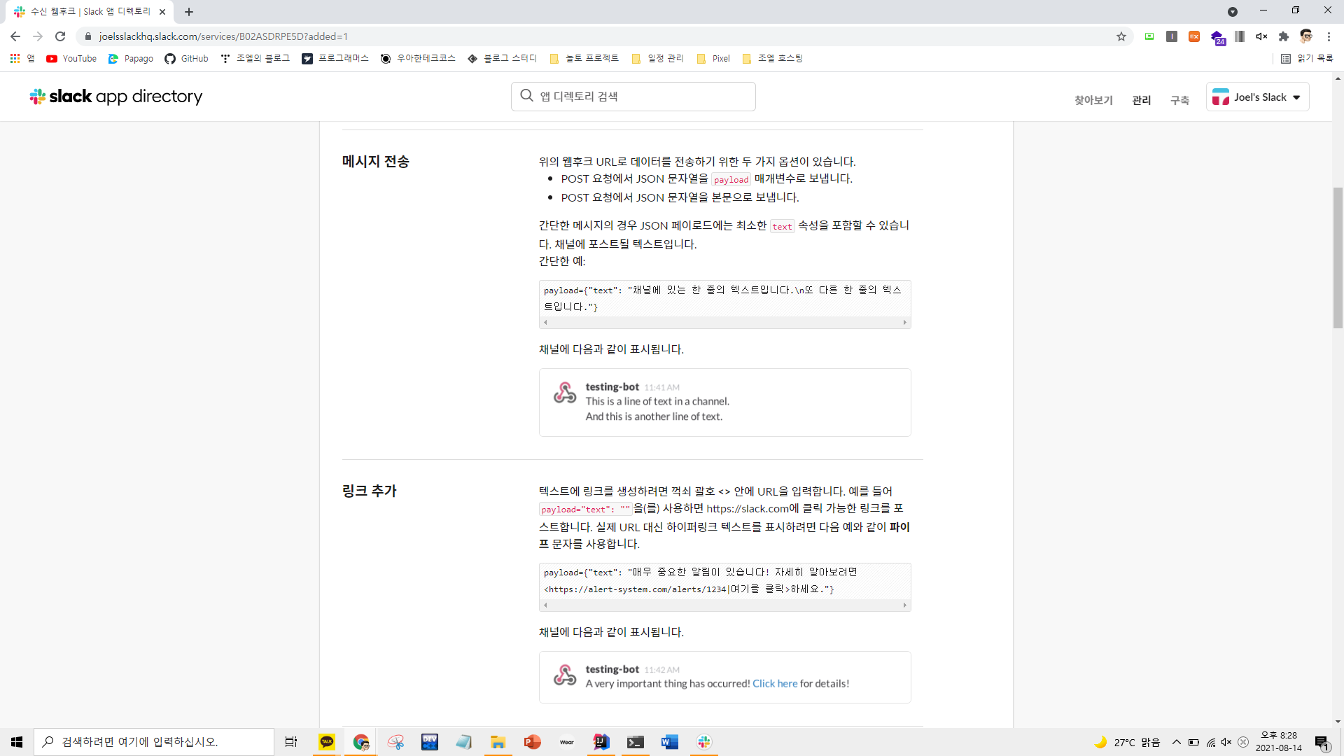 3. Slack 웹 페이지에서 'Incoming WebHooks' 앱 추가 승인