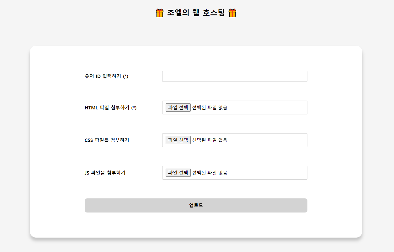 맨 처음 버전은 이렇게 생겼었어요. HTML 폼에 유저 ID, HTML, CSS, JS 파일을 첨부하는 형식이죠.
